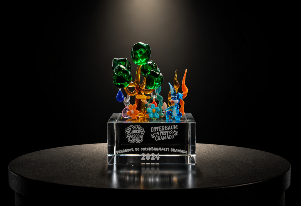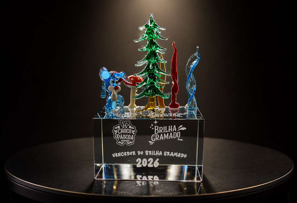A Cristais de Gramado assinou o troféu do Brilha Gramado – concurso de decoração de Páscoa e do Osterbaumfest – Melhor Decoração da Árvore de Páscoa, levando a essência do cristal Murano para dois dos momentos mais simbólicos do evento. Cada peça carrega o olhar sensível do artesão, a precisão técnica e a paixão que transforma o cristal em expressão.