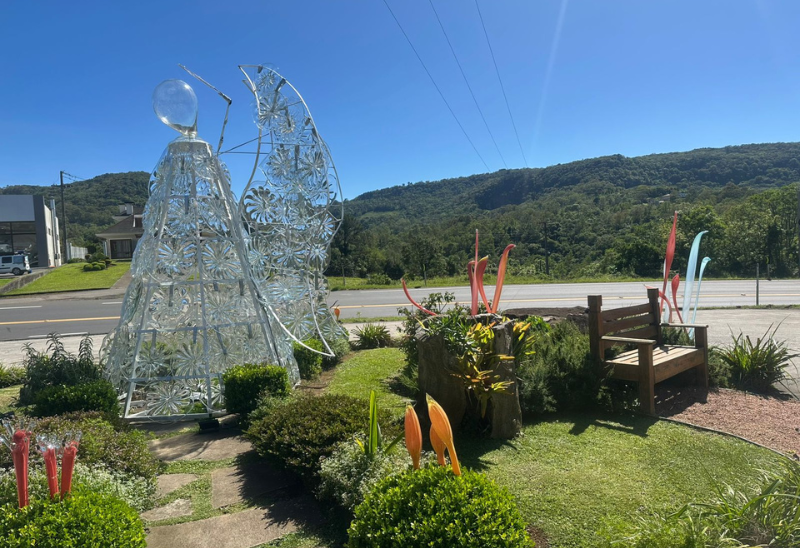 Ainda no Jardim de Cristal, na área externa da empresa, recentemente foi instalado o Anjo de Cristal – tradicional obra que, por muitos anos, permaneceu na Praça das Etnias. “Quando criamos e produzimos o Anjo de Cristal, foi como um presente para a cidade, pois representava todo o encantamento presente no Natal Luz. Depois de mais de 10 anos levando arte à Praça das Etnias, deu espaço a uma importante homenagem aos 150 anos da imigração italiana. A nova escultura, inaugurada em maio deste ano, foi idealizada pela artista plástica Débora Irinion — mistura ferro, madeira e cristal, compondo uma narrativa visual com imagens estilizadas e contemporâneas”, explica Telmo.